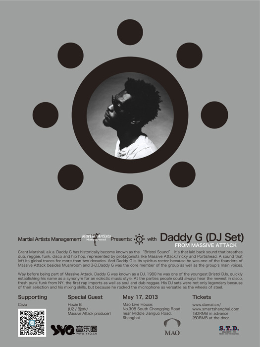 One of the founders of Massive Attack comes to Shanghai for a DJ show at MAO Livehouse. Daddy G was one of the architects of the "Bristol sound" that includes not only Massive Attack but also Tricky, Portishead and the hundreds of trip-hop acts they inspired. He was also one of the main vocalists on Massive Attack's records and has been a DJ in his own right for 30 years. Here's a chance to see one of the originators of a grand slice of electronic music history, at one of Shanghai's largest and best-sounding venues.Daddy G (DJ Set)