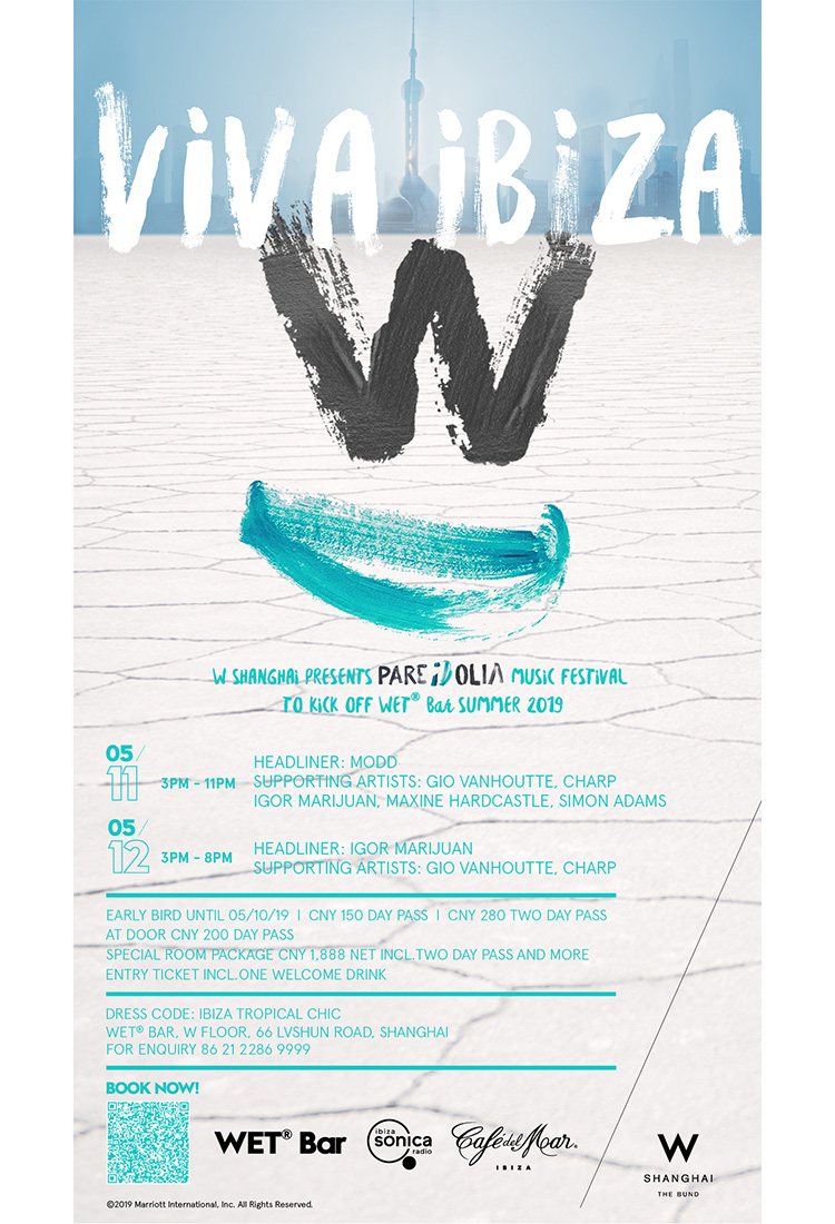 W Shanghai introduces PAREIDOLIA Music Festival at WET Bar this summer, to celebrate its new theme: Ibiza, with a new menu and decorations, featuring the world-famous Spanish island. PAREIDOLIA is a music festival experience created by Ibiza and Mexico's Tulum Universes in 2016. From 3-11pm on May 11, headliner Mode will be joined by Gio Vanhoutte, Charp, Igor Marijuan, Maxine Hardcastle and Simon Adam for an unforgettable pool party experience. On May 12 from 3-8pm, Gio and Charp join Igor Marijuan for a live show, followed by a trio of drummers. There'll also be interactive setups like tribal hair braiding, neon face painting and a sky fire performance. Entry ticket includes one welcome drink.VIVA IBIZA